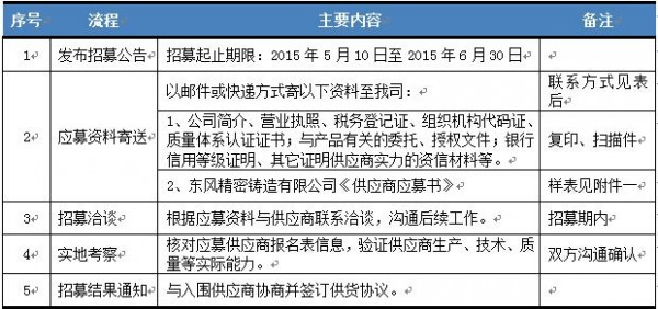 通過本次招募尋求1-2家滿足條件的覆膜砂模具供應商,作為東風精鑄制造業務鏈的有效組成部分。
