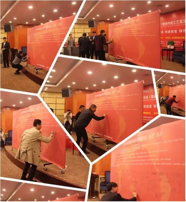 在東風精鑄、精鑄分會組織倡議下,10月28日,傳統精鑄第五屆高層論壇順利舉行,來自國內重點精鑄企業、科研院所、社團等 95名代表,在安徽合肥共同見識了《中國傳統精鑄業綠色可持續發展合肥共識》簽字儀式,其中60余名代表在幕板上簽字表達了綠色可持續發展的決心。