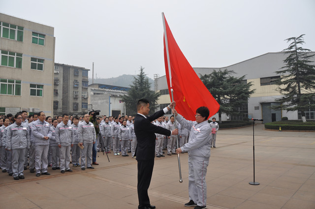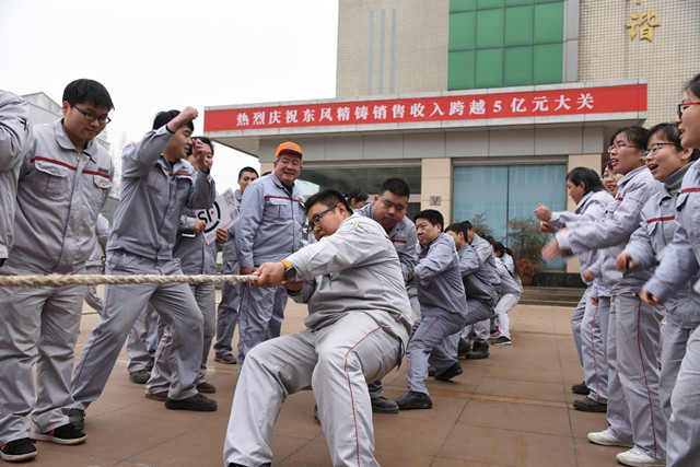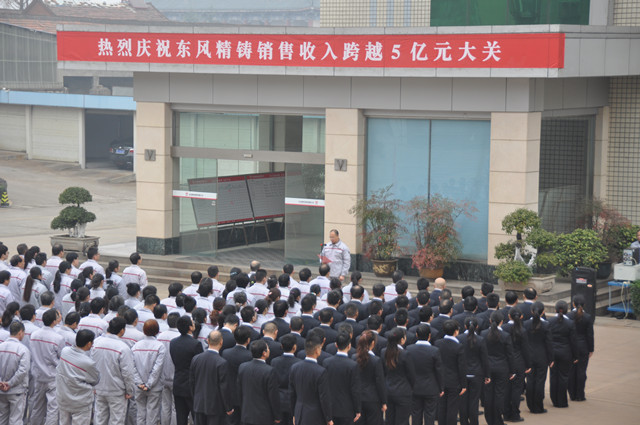 19日上午9時18分,公司在和鼎廣場舉行了銷售收入跨越五億元慶祝儀式。首先,杜孔明總經理致辭,熱烈祝賀東風精鑄銷售收入跨越五億元大關;隨后,公司銷售人員代表誓師,黨委書記孫長虹向銷售總部授予“邁向八億”戰旗;慶祝儀式上,與會員工在印有“倡導精益,打擊陋習” 倡議書的噴繪上簽字,表達堅決與陋習告別的決心。慶;顒舆進行了喜慶歡樂的拔河比賽。